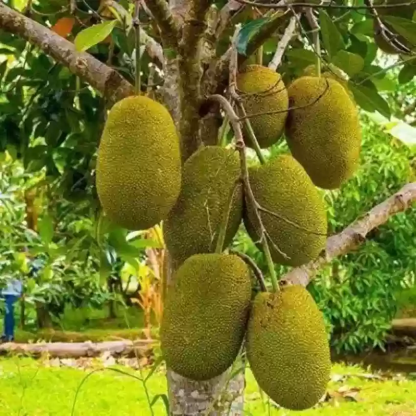 The Jackfruit plant, scientifically named Artocarpus heterophyllus, stands tall as a colossal, evergreen tree revered for its sheer size and hefty, spiky-skinned fruits. This giant tree flaunts a dense canopy of elongated, glossy leaves and greenish-yellow flowers, casting a majestic presence. Thriving in tropical climates, the Jackfruit tree thrives in well-drained soil and abundant sunlight. Propagated via Grafted, it graces landscapes, orchards, and gardens, becoming a statement piece with its grandeur. At its core lies the Jackfruit—a large, spiky-skinned fruit housing sweet,hued, fibrous flesh. Known for its versatile taste and meaty texture, it’s savored ripe, cooked, or even as a meat substitute in various culinary delights. In essence, the Jackfruit plant signifies more than a fruit-bearing tree; it embodies grandeur and multipurpose utility-a symbol of size, flavor, and cultural depth that enriches both landscapes and heritage.